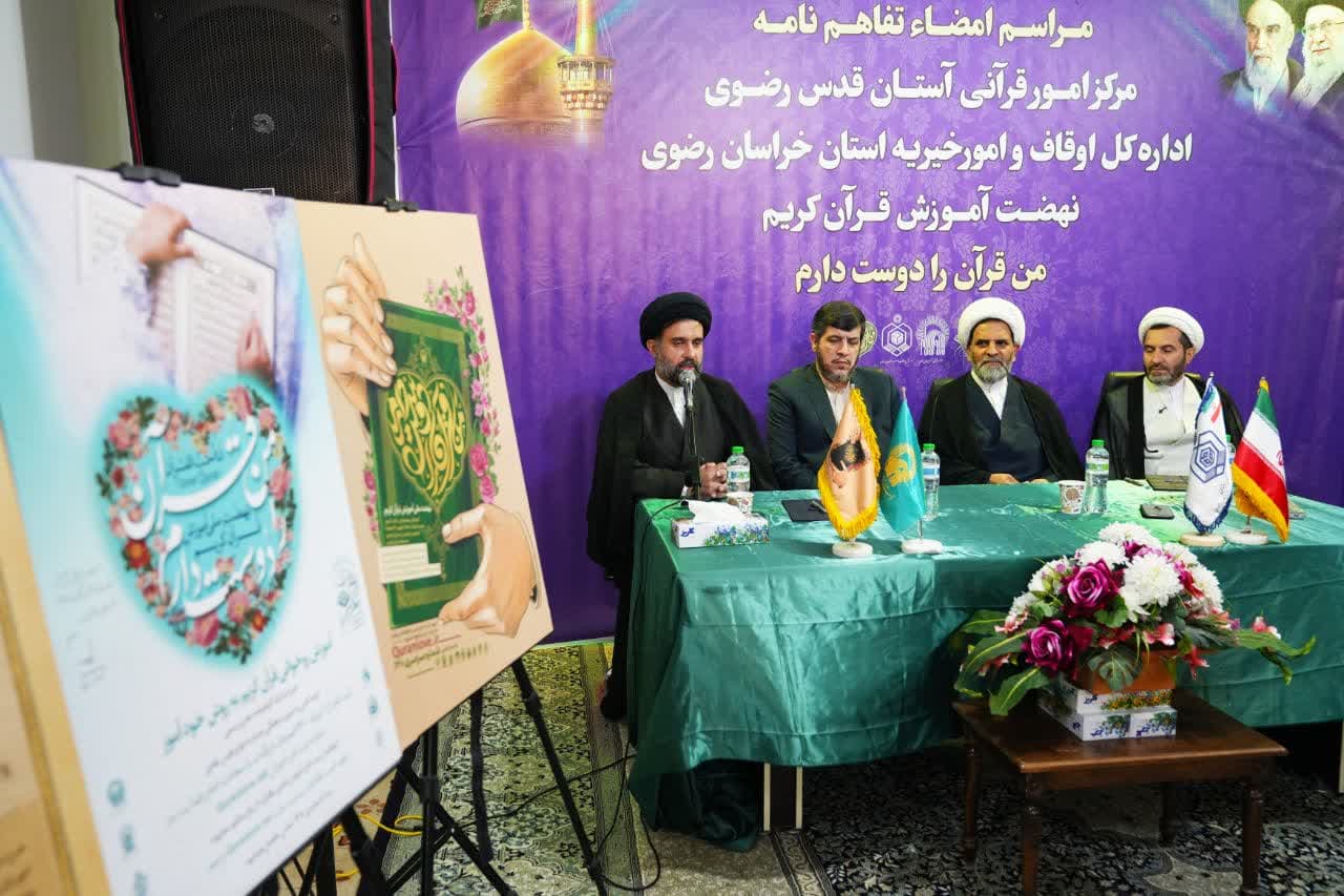 به گزارش رضوانیون، با حضور مدیرکل اوقاف و امور خیریه خراسان رضوی و رئیس سازمان علمی و فرهنگی آستان قدس رضوی، تفاهمنامه همکاری مشترک اداره کل اوقاف و امور خیریه خراسان رضوی و مرکز قرآن کریم آستان قدس رضوی ، برای طرح “من قرآن را دوست دارم” در حسینیه حضرت زینب کبری سلام الله علیها(موقوفه مرحوم حاج محمد عزیزی) امضا شد.