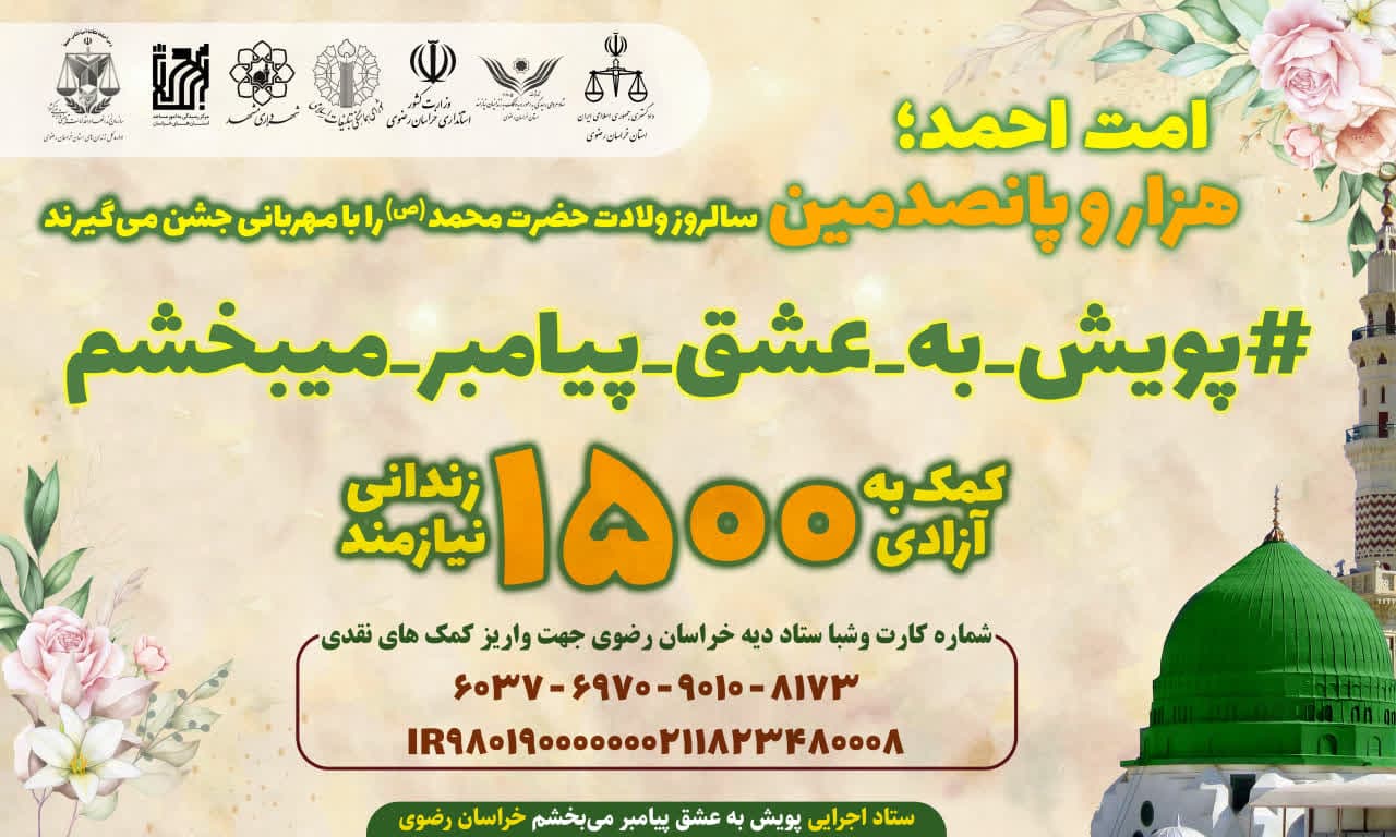 به گزارش رضوانیون، حجتالاسلام محمد سلطانی رییس شورای هماهنگی تبلیغات اسلامی خراسان رضوی بیان کرد: «به مناسبت میلاد پیامبر گرامی اسلام، تفاهمنامهای بین شورای هماهنگی تبلیغات اسلامی و ستاد دیه استان منعقد شد تا در قالب پویش «به عشق پیامبر میبخشیم»، زمینه آزادی ۱۵۰۰ زندانی مؤثر و غیرعمد فراهم شود. این اقدام بخشی از برنامه ملی آزادسازی ۱۷ هزار زندانی در سراسر کشور است.»